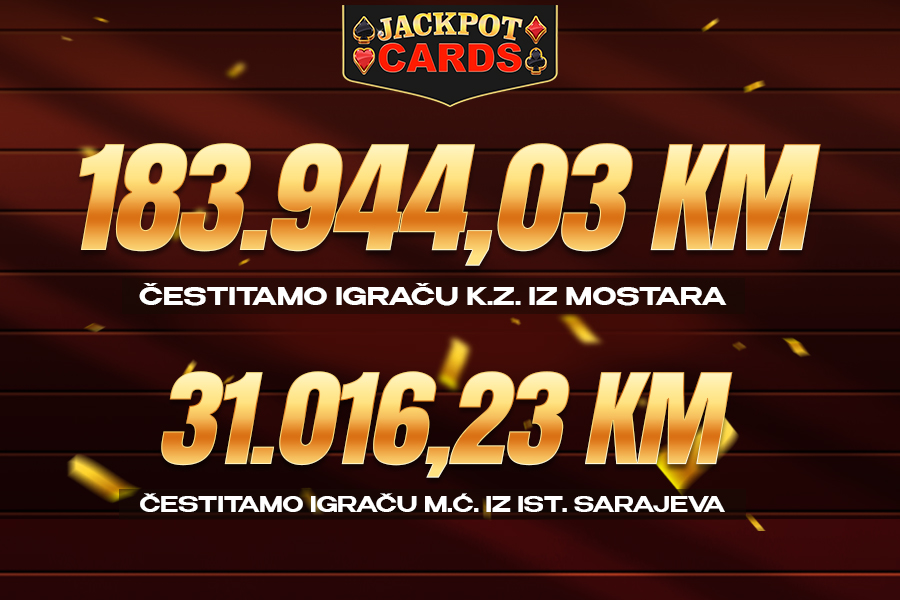 Nakon što je danas M.Ć. iz Istočnog Sarajeva osvojio Jackpot treće razine u iznosu od 31.016,23 KM, sada je i K.Z. iz Mostara, u igri 40 Super Hot na ulogu od 2 KM po spinu dobio JackpotCards bonus, pronašao tri karte sa znakom pika i osvojio fantastičnih 183.944,03 KM!