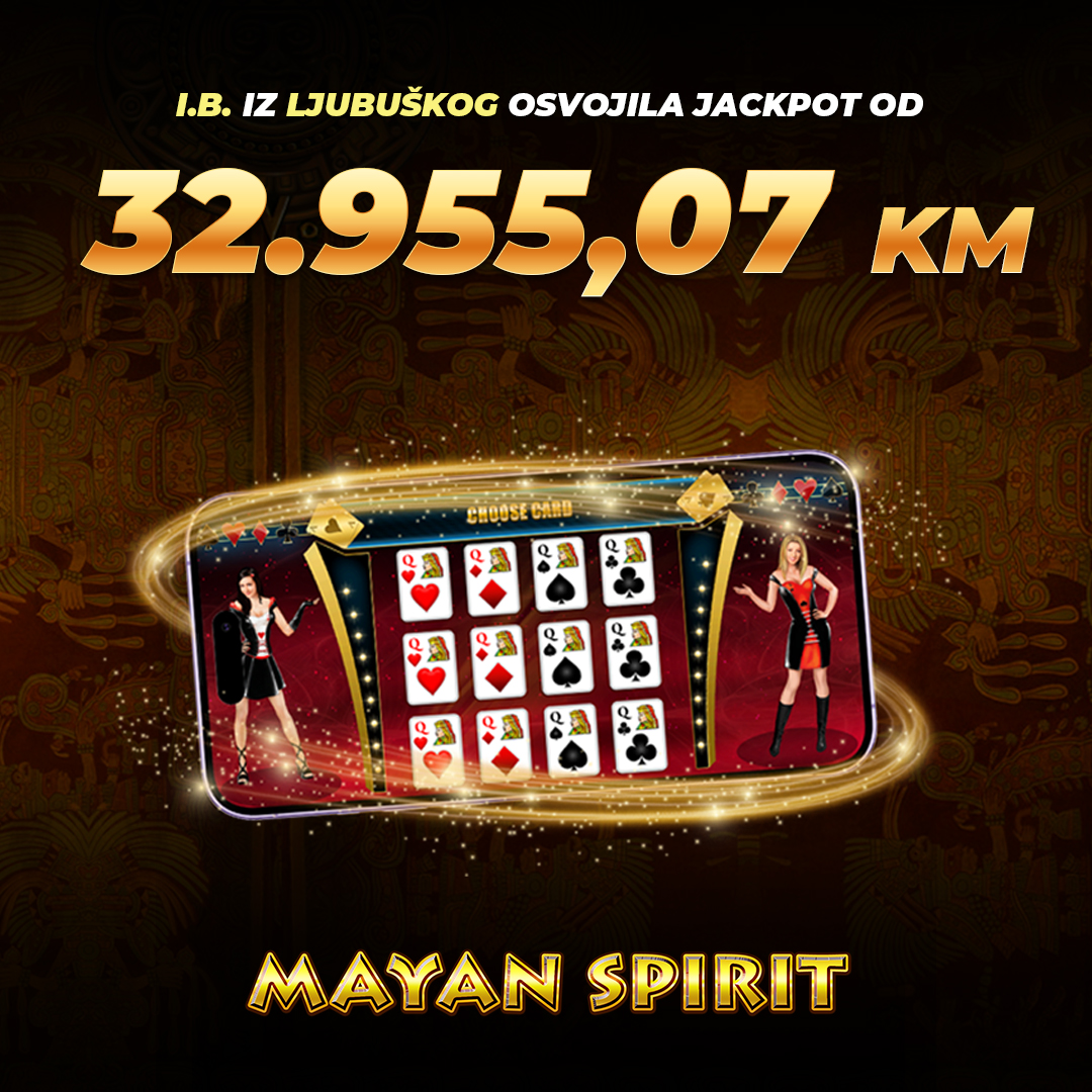 Čestitamo igračici I.B. koja je u igri Mayan Spirit na ulogu od 2 KM po spinu osvojila Jackpot Cards bonus, pronašla tri karte sa znakom srca i osvojila fantastičnih 32.955,07 KM!