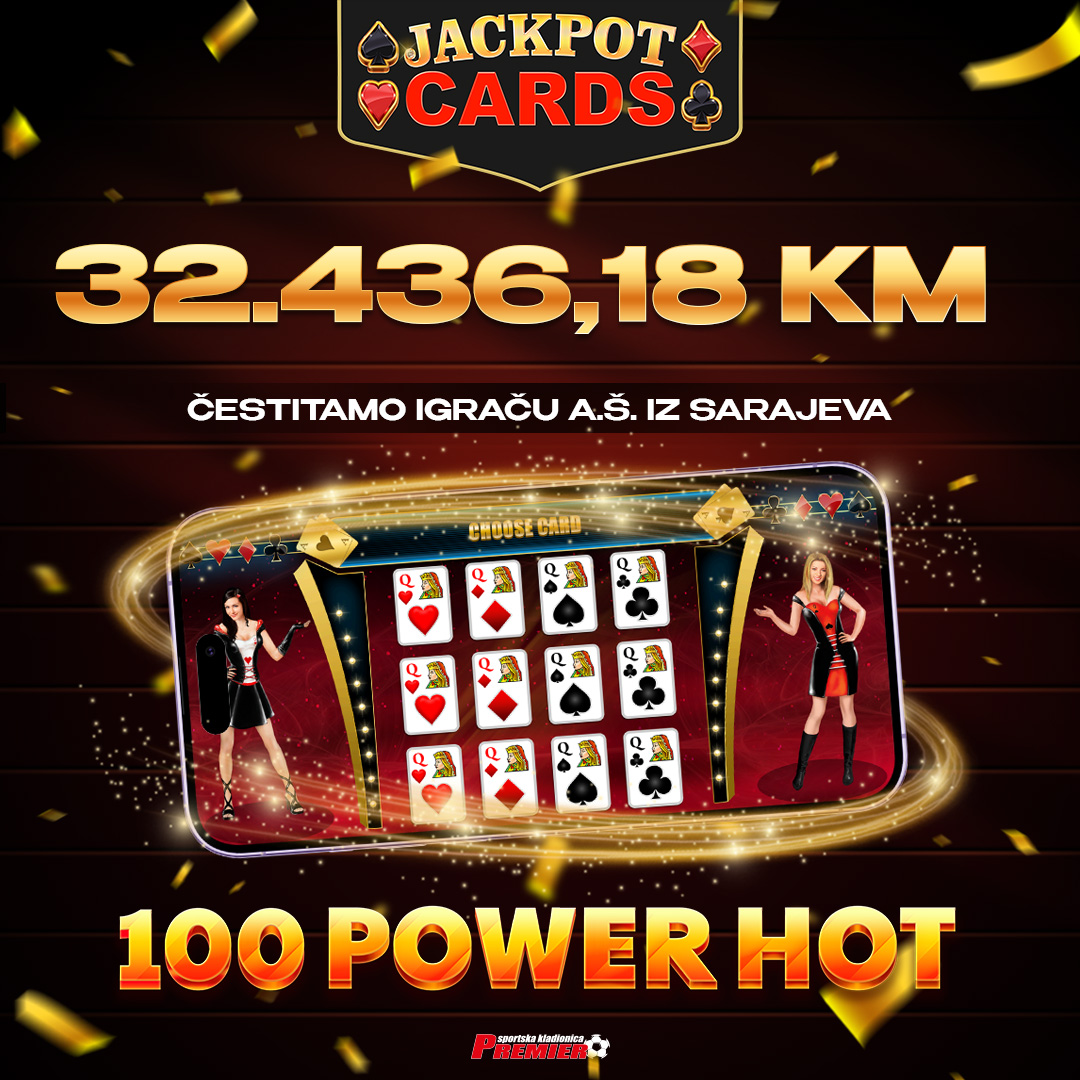 Premier kladionica nastavlja s izvrsnim Jackpotovima na online casino igrama! Ovoga je puta sretne ruke bio igrač A.Š., koji je, igrajući slot igru 100 Power Hot s ulogom od 6 KM po spinu, osvojio JackpotCards bonus. Izvukao je tri karte sa znakom srca i ostvario fantastičan dobitak od 32.436,18 KM.