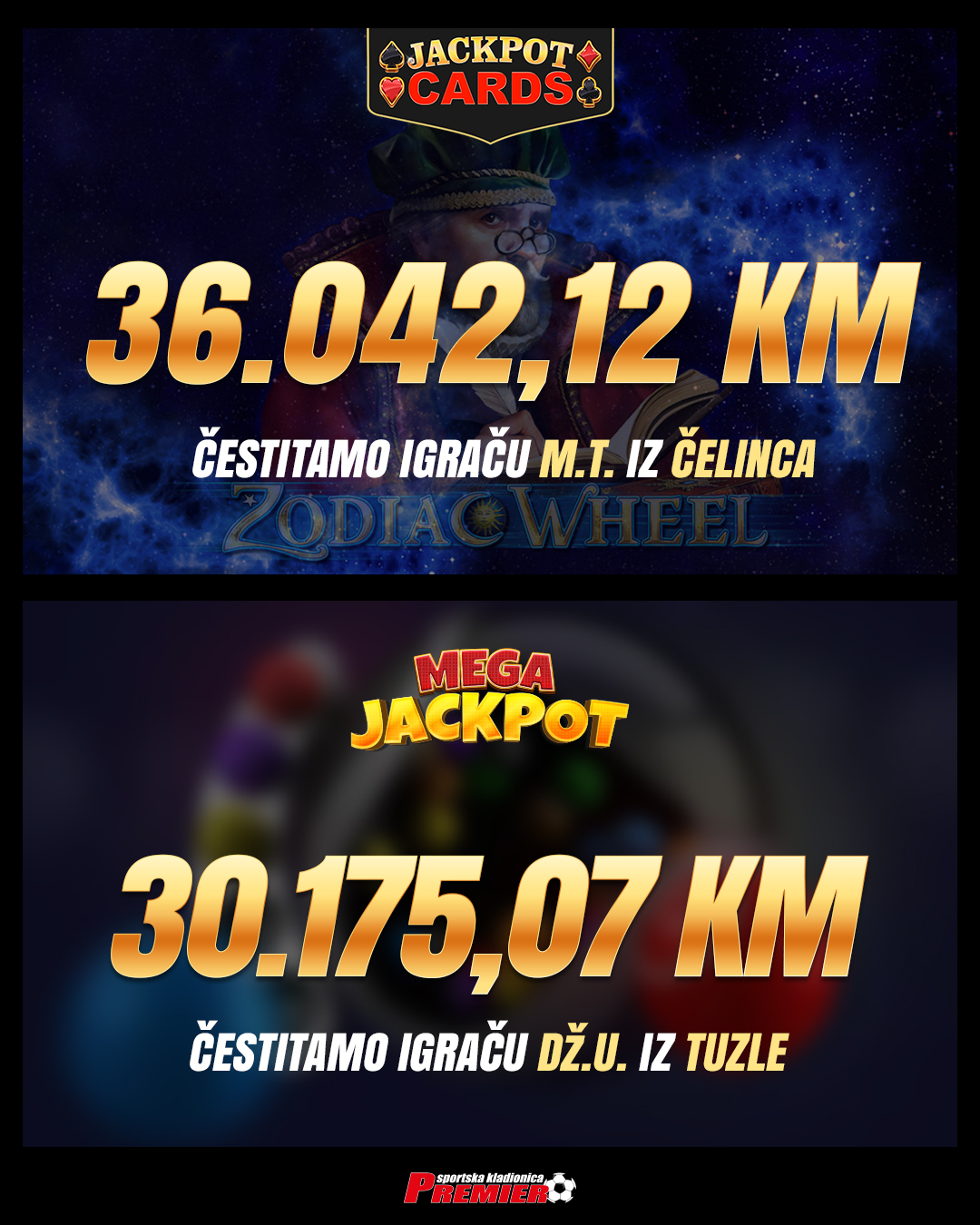 M.T. iz Čelinca je u igri Zodiac Wheel na ulogu od 10 KM po spinu dobio JackpotCards bonus, pronašao tri karte sa znakom srca i osvojio sjajnih 36.042,12 KM!