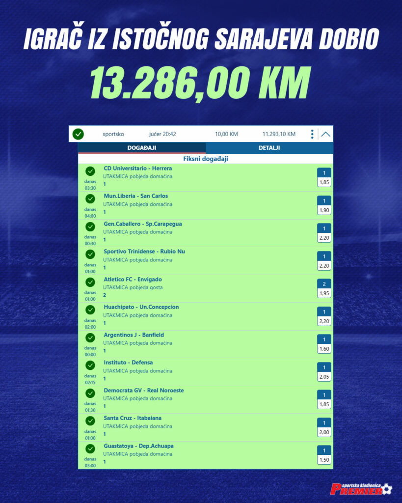 Listić danaIgrač iz Istočnog Sarajeva dobio 13.286,00 KM! LISTIĆ DANA – Čestitamo našem igraču iz Istočnog Sarajeva koji je pogodio 11 parova i na uplatu od 10 KM dobio sjajnih 13.286,00 KM (11.293,10 KM isplata + 1.992,90 KM porez)!