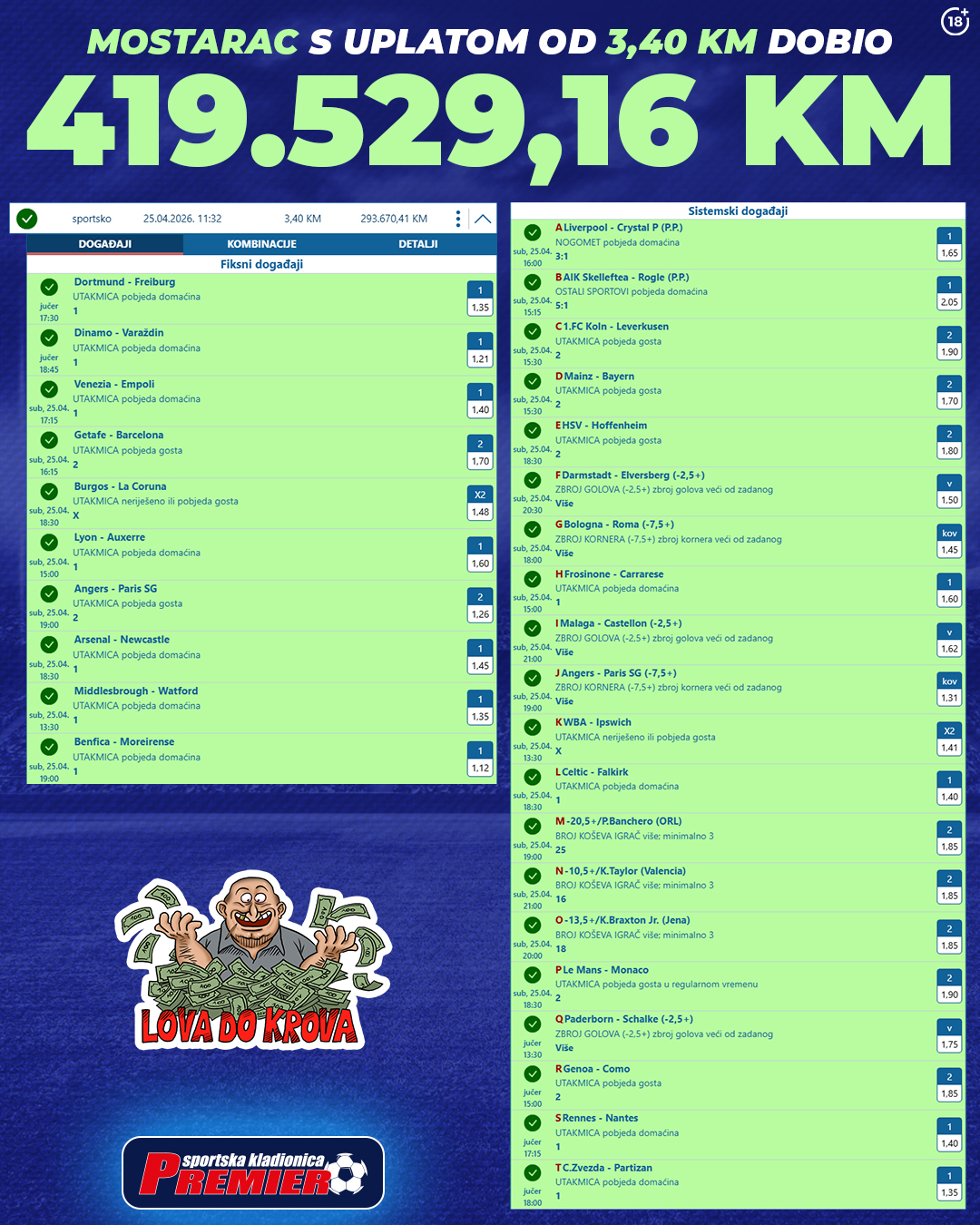 Dobitak od preko 419 tisuća maraka sam po sebi bio bi vijest godine – no Premier kladionica već ima rekord za 2026. Prije samo dva mjeseca igrač iz Gruda osvojio je nevjerojatnih 840.303,40 KM. Ovi iznosi potvrđuju da sportska kladionica Premier ostaje mjesto gdje se isplaćuju najveći i najspektakularniji dobitci u Bosni i Hercegovini.